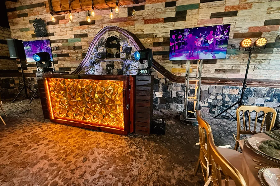En salones cerrados, el control visual es mayor y cada elemento se nota más. Aquí es fundamental mantener un montaje ordenado, compacto y bien alineado con el espacio. El exceso de equipo o iluminación puede saturar visualmente el entorno y romper la estética del evento.